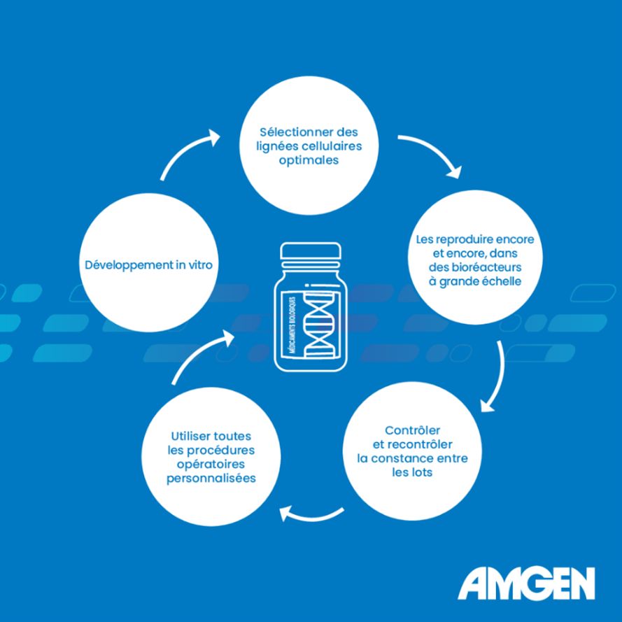 Le développement de produits biologiques, y compris les biosimilaires, exige des connaissances hautement spécialisées. Chez Amgen, nous utilisons le même réseau de scientifiques et les mêmes installations de pointe pour développer et fabriquer nos médicaments biosimilaires que pour nos produits biologiques innovants. Cela signifie que nos biosimilaires respectent les mêmes processus et les mêmes normes de qualité que nos produits biologiques.