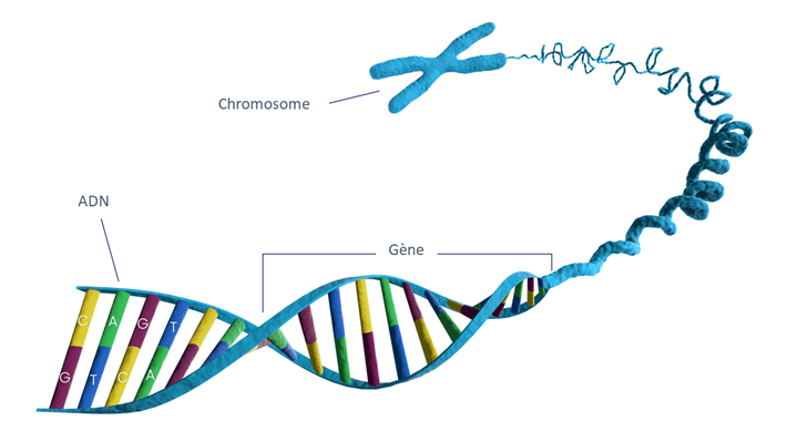 L'ADN est une molécule très longue et enroulée que l'on trouve dans le noyau, ou centre de commande, d'une cellule. Elle fournit le plan complet de la construction et du fonctionnement de toute forme de vie, qu'il s'agisse d'un microbe, d'un oiseau ou d'un être humain. L'information contenue dans l'ADN est stockée sous la forme d'un code composé de quatre éléments de base, appelés nucléotides. L'ordre d'apparition des nucléotides s'apparente à l'ordre des lettres qui forment les mots, les phrases et les histoires. Dans le cas de l'ADN, l'ordre des nucléotides forme différents gènes. Chaque gène contient les instructions pour une protéine spécifique.