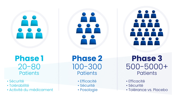 Si les études précliniques d'un médicament ne révèlent aucun problème de sécurité grave, les chercheurs peuvent demander l'autorisation réglementaire de procéder à des essais cliniques sur l'homme. La recherche clinique comporte trois phases, et un médicament doit satisfaire à des critères de réussite à chaque phase avant de passer à la suivante.